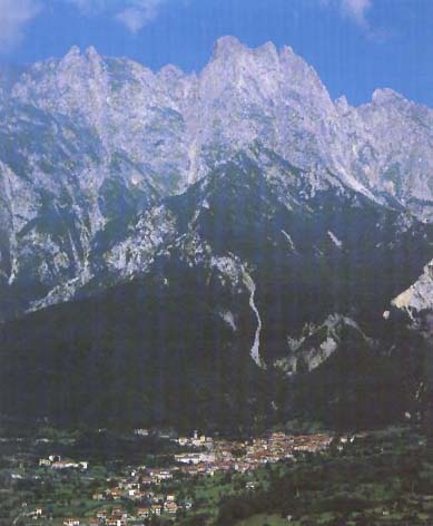 : Panorama del paese ai piedi della montagna