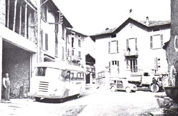 La piazza, il municipio, l'officina Bassi, una "Corriera" e il signor Bortolo Bassi